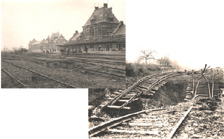Ath Station and bomb damaged railway nearby In the afternoon the squadron were to be part of the RAF's biggest operation of the day. 80 Wing put up 62 aircraft for a raid on Rebaix airfield north of Ath. No.s 2 AFC, 54 and 103 Sqns were to carry out a bombing attack protected by No.s 4 AFC and 88 Sqns. At 1345 the CO Major Nethersole & 2nd Lt. Corey led off a formation of eight DH9s. The other crews were: Lt. Hallawell & Sgt. Watkinson, Capt. Stubbs & Lt. Bannerman, Sgt. Driver & Sgt. Sgt. Huckle, Sgt. Haines & 2nd Lt. MacDonald, Lt. Hett & 2nd Lt. Nicholls, 2nd Lt. Jackson & Sgt. Westcott, 2nd Lt.s Tennant & Drummond. At 1415 2nd Lt.s Tennant & Drummond returned after half an hour having experienced engine trouble. At 1425 Lt.s Chrispin & Slater took off on reconnaissance but returned at 1445 having experienced engine trouble. At 1430 a very low level attack was made on Rebaix by No 54 Sqn and 2 AFC, with the 103 Sqn formation above at 2000 ft. Major Nethersole & 2nd Lt. Corey leading the DH9 formation dropped a 230lb bomb between hangars demolishing one of them and destroying two machines. Other buildings were also destroyed and the airfield generally shot up. Altogether No 103 Sqn dropped 4 230lb and 6 112lb bombs, the other squadrons dropped 116 25lb bombs. Other targets around the airfield were strafed. On the return journey the squadron had to fight all the way to the lines against some 30 Fokkers, claiming three destroyed and two OOC. Capt Stubbs & Lt. Bannerman claimed a Fokker destroyed (at 1430) and Lt. Hett & 2nd Lt. Nicholls claimed two Fokkers destroyed (at 1440), though Nicholls died of wounds from this action. Other claims were made that day by Sgt. Haines & 2nd Lt. MacDonald (at 1435 1 EA DES) and Lt. Hallawell & Sgt. Watkinson (at 1440 1 EA DES). All aircraft returned at 1505. Photos Newby Collection @ airwar1.org.uk |