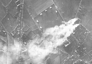 German airfield at Marcq with screening smoke, six canvas hangars visible.